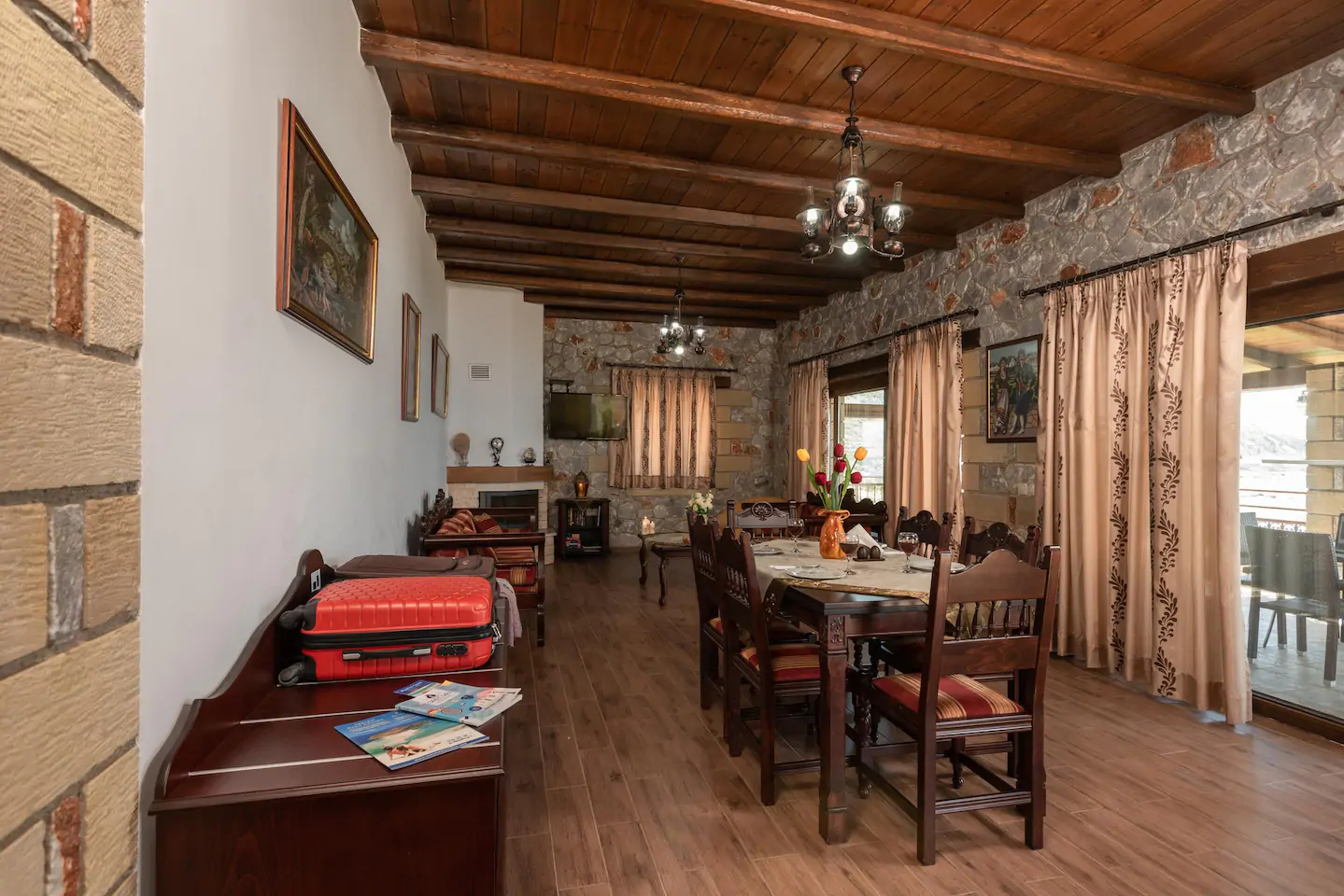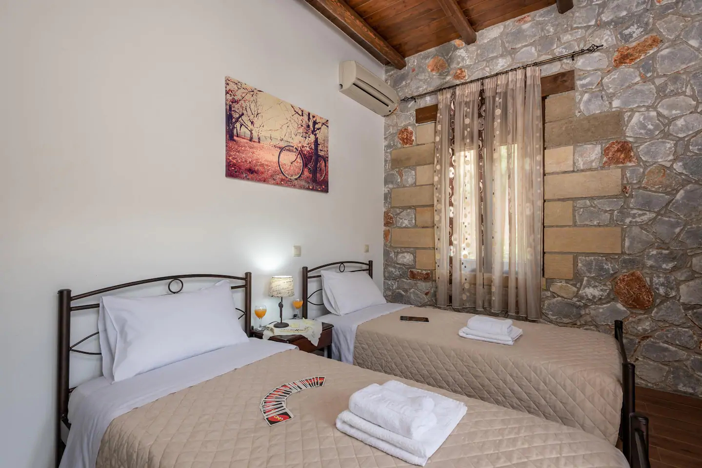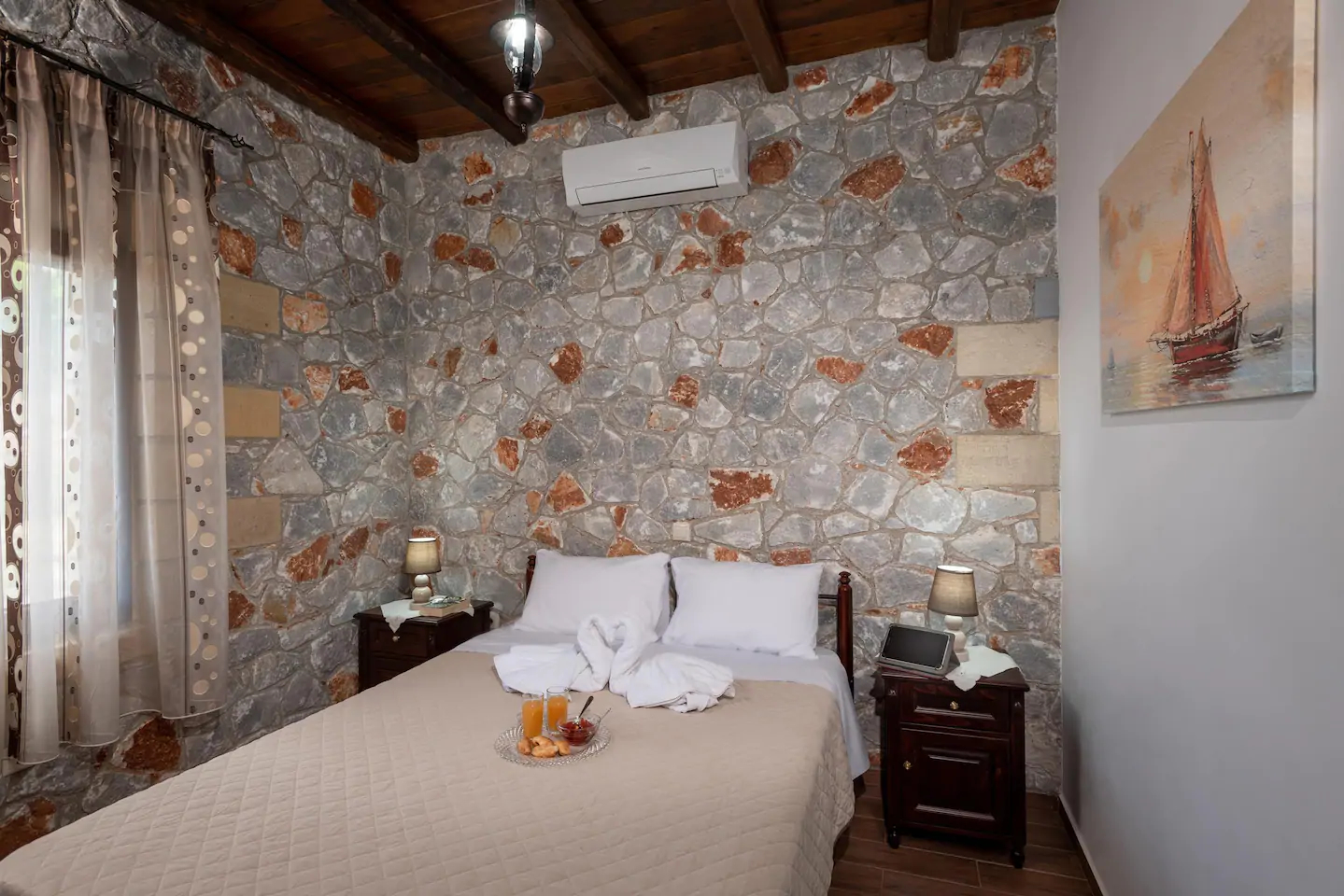 Sunset Traditional House is built with natural materials, entirely of stone and wood, and consists of 3 separate bedrooms with air-conditioning, as well as large closets, a spacious living room with adjoining dining area, a fully equipped kitchen and an outdoor dining-living area about 40 square meters.