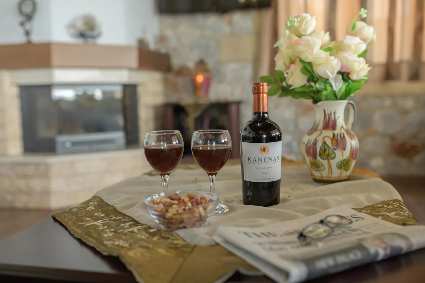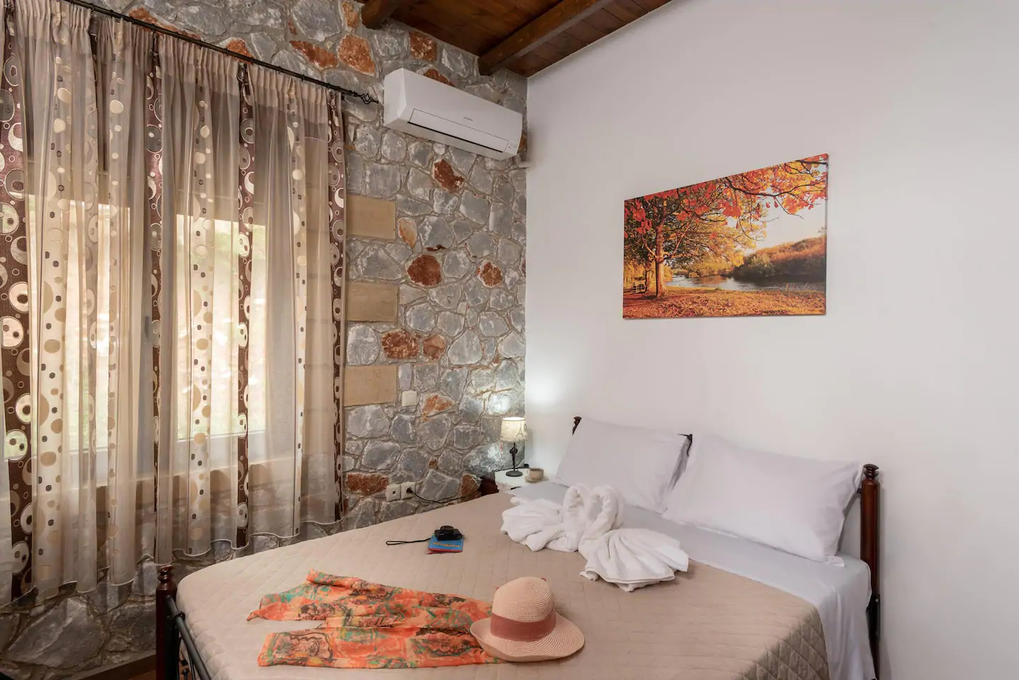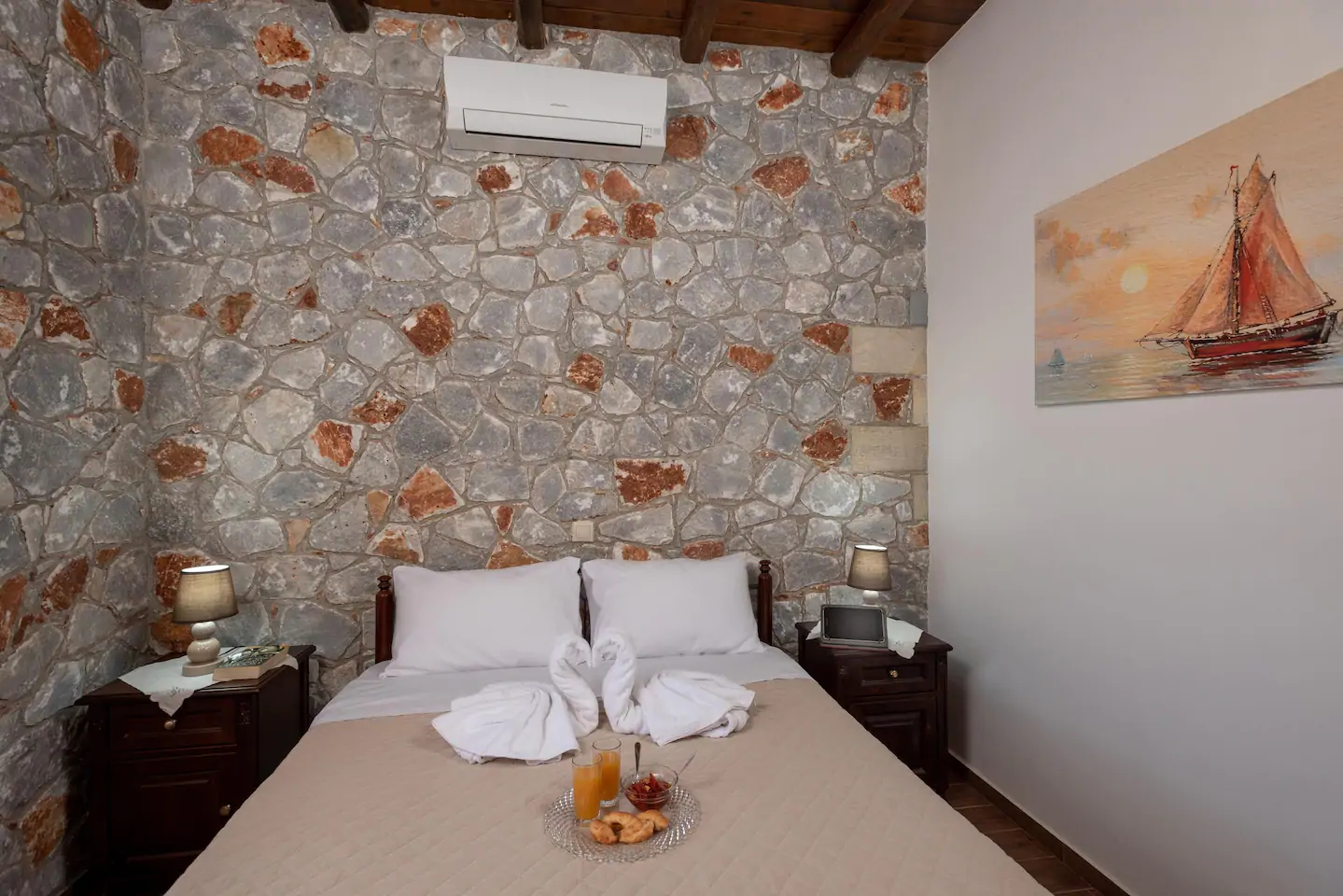 Sunset Traditional House is built with natural materials, entirely of stone and wood, and consists of 3 separate bedrooms with air-conditioning, as well as large closets, a spacious living room with adjoining dining area, a fully equipped kitchen and an outdoor dining-living area about 40 square meters.